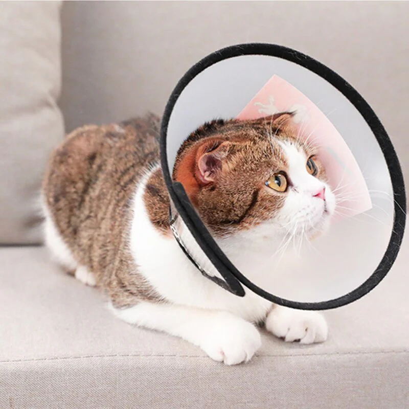 Comfortable and adjustable e-collar for cats and dogs, designed to prevent licking and support safe recovery after surgery or wounds.